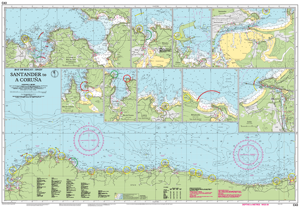 On this edition the chart specification has been improved to show coloured light flashes. A new plan is included of Avilés showing the approach to Avilés and navigation to the yacht harbour. There has been general updating throughout.