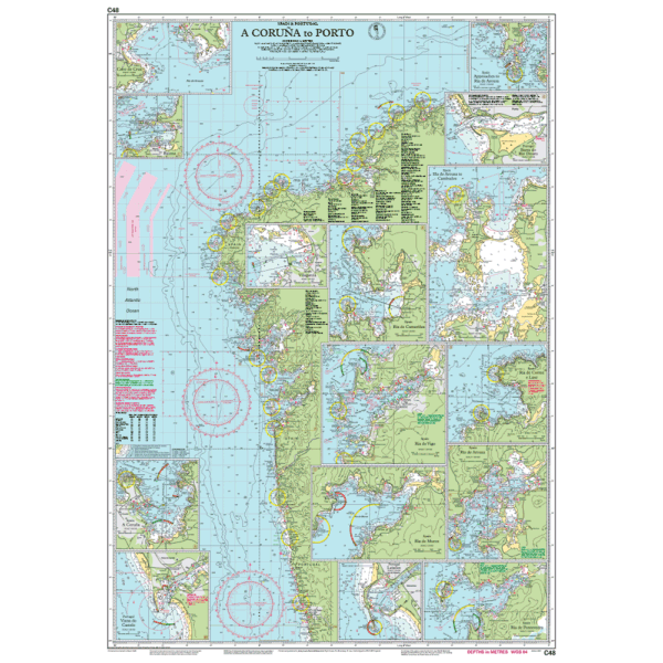 On this edition the chart specification has been improved to show coloured light flashes. There have been numerous updates to harbour developments across the chart. The plan of Ría de Camariñas has been extended westward to include a larger scale approach and full charting of Las Quebrantas bank. There has been general updating throughout.
