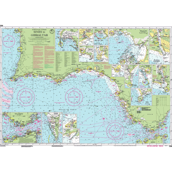 On this the latest depth surveys have been applied. Harbour developments in Gibraltar are included as are the latest firing practice areas in Golfo de Cadiz. The chart specification has been improved to show coloured light flashes. There has been general updating throughout.